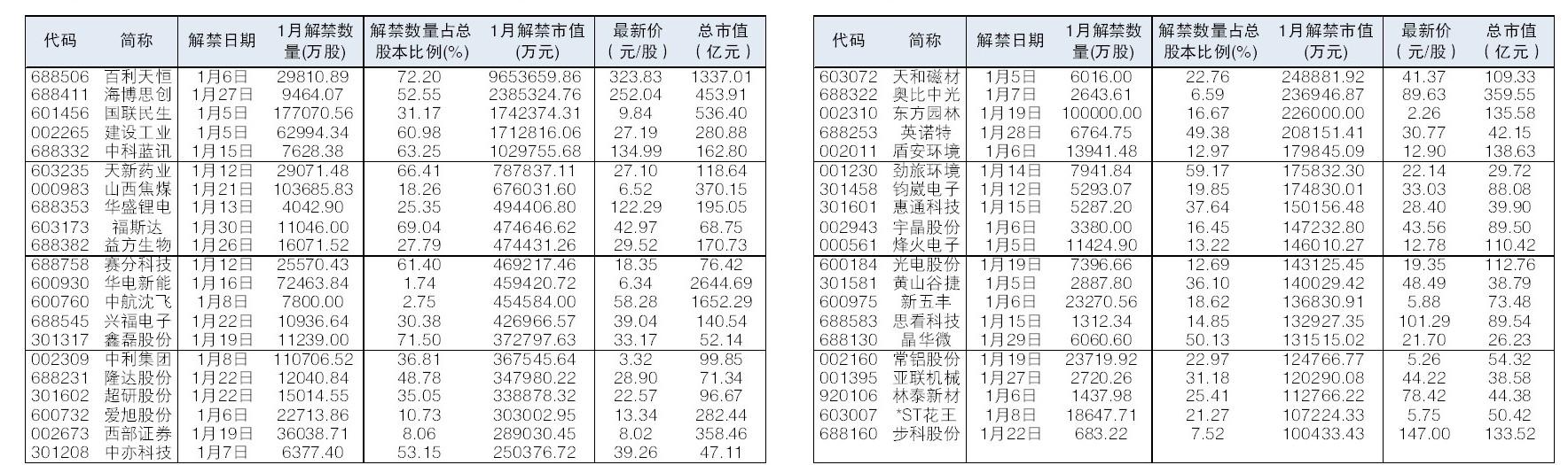 根据Wind数据统计,1月A股限售股解禁呈现“数量与市值双高”特征。解禁数量达108.53亿股,以1月5日收盘价计算,解禁市值超过2700亿元,在2026年月度解禁规模中处于较高水平。其中,41股解禁市值超过10亿元,百利天恒、海博思创、国联民生等解禁市值居前。
