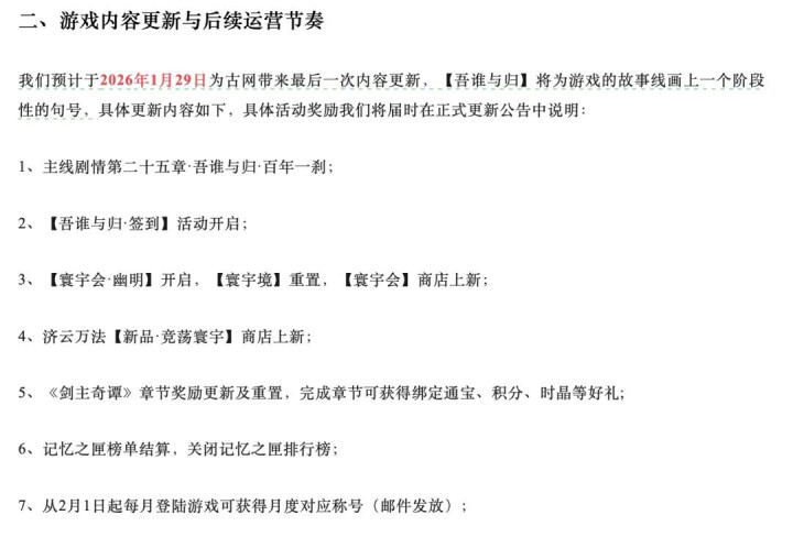 公告同时表示,自2024年起,《古剑奇谭网络版》已逐步进入稳定维护阶段,不再进行大规模内容更新。在本次游戏官方账号体系升级合并并完成新剧情更新后,游戏服务器将继续维持稳定运营,保持基础赛季的轮换和主要节日活动的开放,以确保玩家的基础游戏体验。