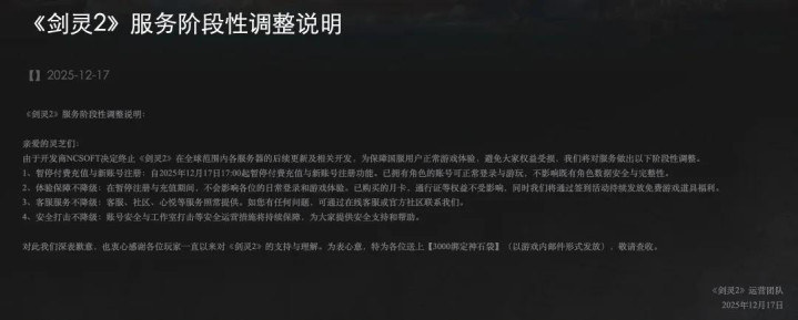 《剑灵2》官方公告宣布,游戏将于全球范围内停止内容更新和开发。