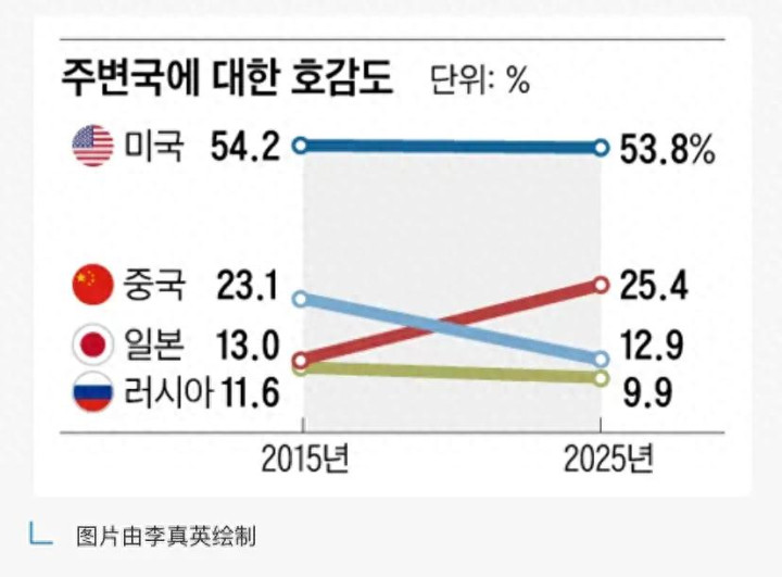 图中不难发现2015年对中国满意度为23.1%,而2025年降至12.9%;日本由10年前的13%升至25.4%(图自网络)