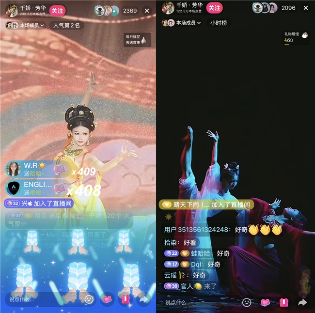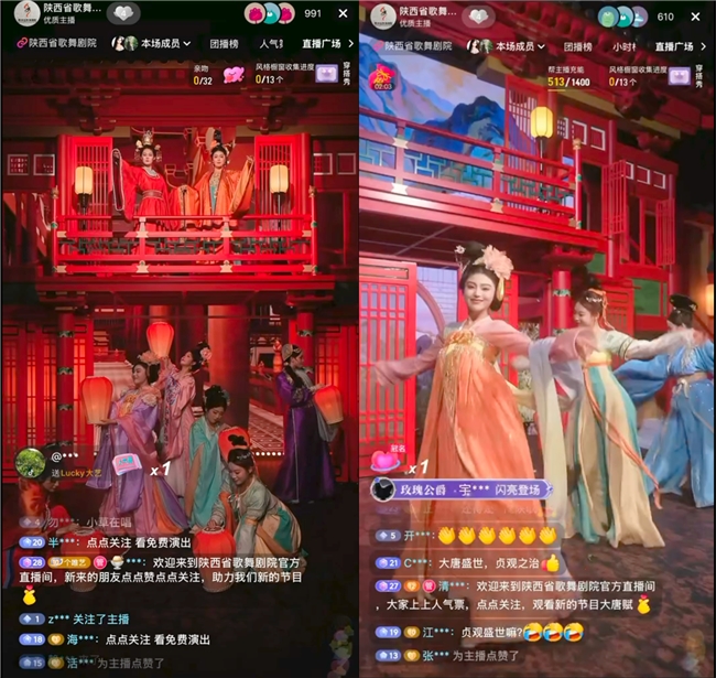 以陕西省歌舞剧院为代表的院团团播,特点则在于以专业歌舞体现地方文化。该院团2025年6月入驻抖音,开播仅一个月,单场直播观看人次即超过210万。编导团队将极具唐文化色彩的代表性剧目《仿唐乐舞》拆解重组,改编为适配竖屏画面的直播版本,并大胆融入《霍元甲》等流行元素,形成以唐文化为特色的团播模式。“一场直播的潜在触达人数,按线下的体量等于把一年的演出都演完了。”陕西省歌舞剧院院长孟丁介绍。