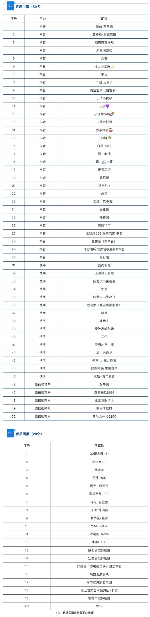 近日,在文化和旅游部市场管理司指导下,中国演出行业协会公布首批网络表演行业“优质主播”和“优质团播”名单。名单经平台推荐、协会按照《网络表演行业优质主播计划试点实施方案》相关要求筛选核实、内容审核、评估及公示,最终确定优质主播50名、优质团播20个。其中,30名抖音个人主播、20个抖音团播团体入选。