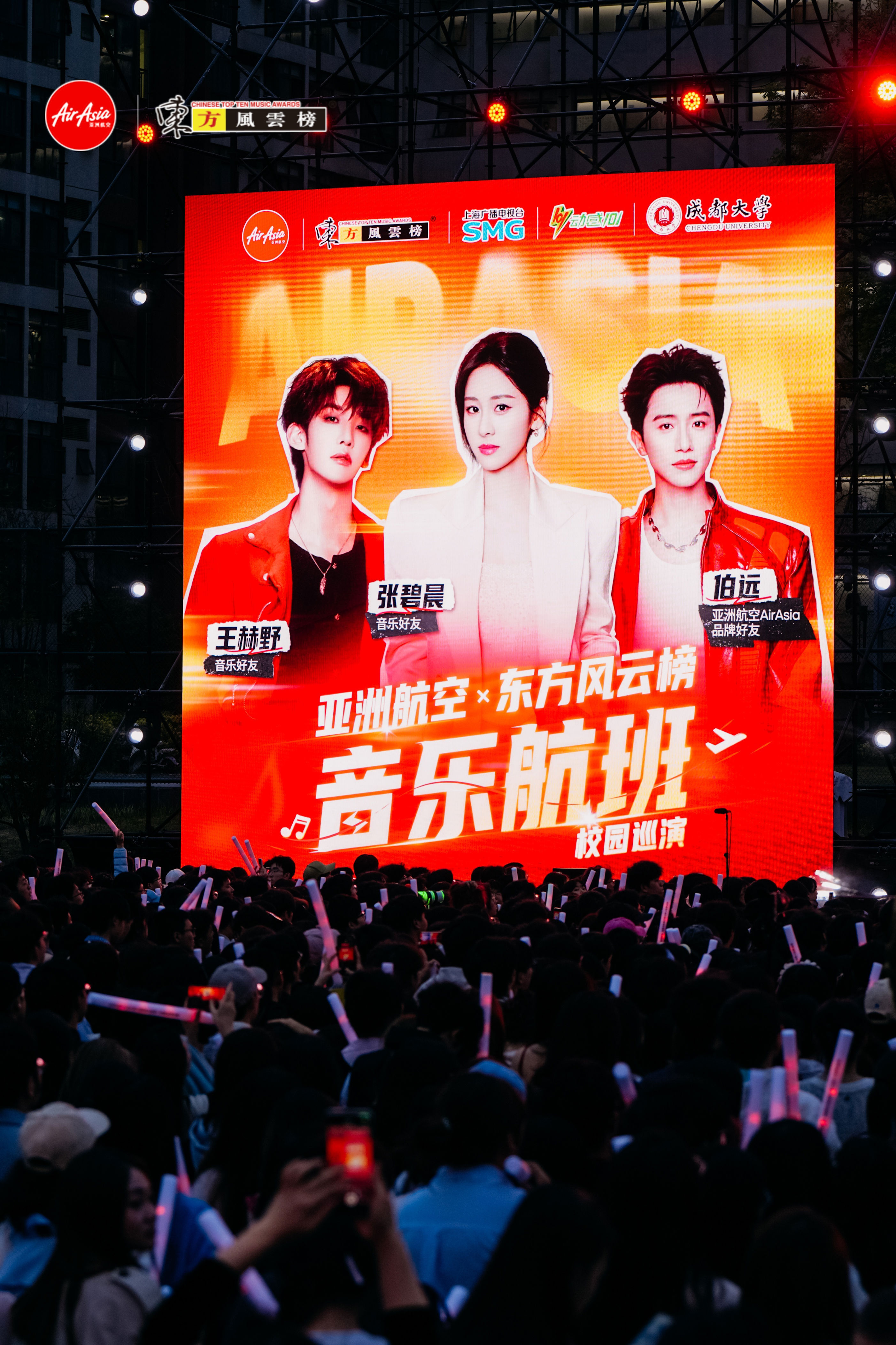 近日,2026亚洲航空×东方风云榜“音乐航班”校园巡演成都站在成都大学热力启航。歌手张碧晨、王赫野以及亚航品牌好友伯远齐聚蓉城,将校园变身“航站楼”,打造了一场深度互动的目的地探索之旅。活动当天,成都大学校园一角变身为富有亚航特色的互动空间。创意十足的航空主题区以亚航东南亚航线网为灵感,吸引了大量学子驻足。
