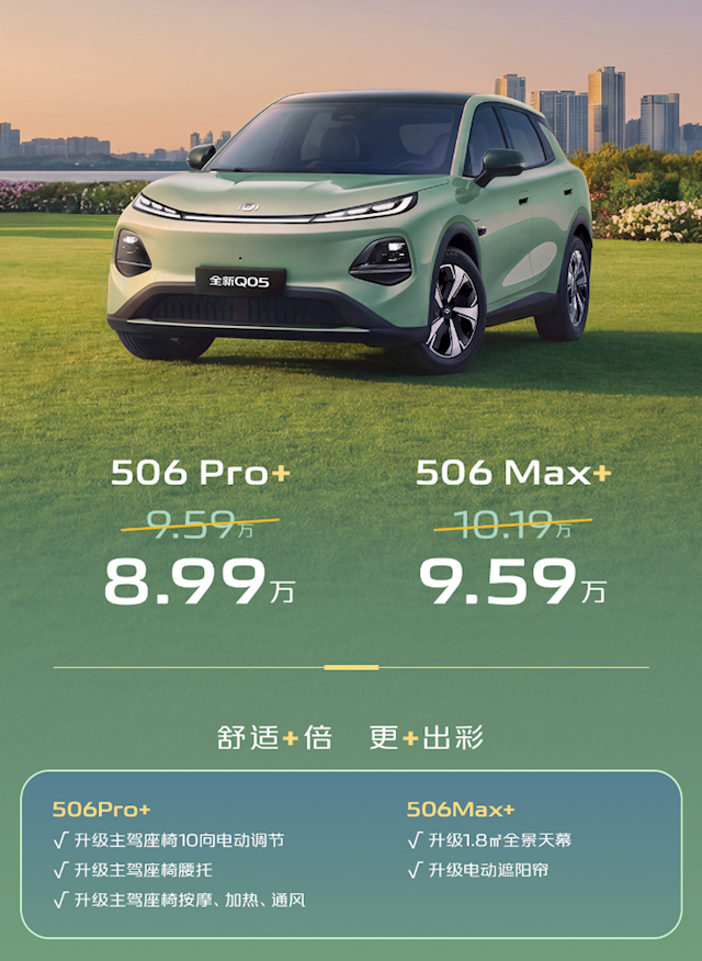 506 Pro+主驾座椅升级为10向电动调节,新增主驾腰托,配齐座椅按摩、加热、通风三大功能; 506 Max+新增1.8m²超大视野全景天幕,更配齐电动遮阳帘,一键开合。