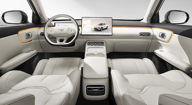 内饰采用环抱式座舱设计,配备15.6英寸2.5K中控屏、10.17英寸全液晶仪表、全车8枚扬声器等,符合当下年轻消费者购车需求,前排有效头部空间达1008mm,二排头部空间990mm,后备厢空间可扩展至1380L。