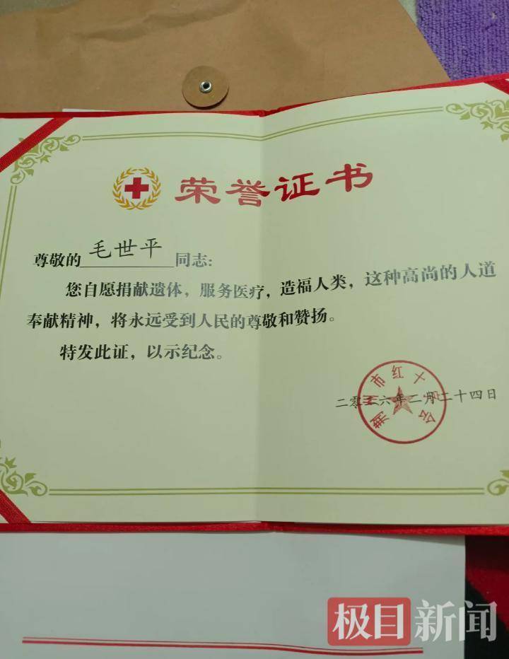 荆州市红十字会颁发的毛世平遗体捐献荣誉证书。(受访者供图)