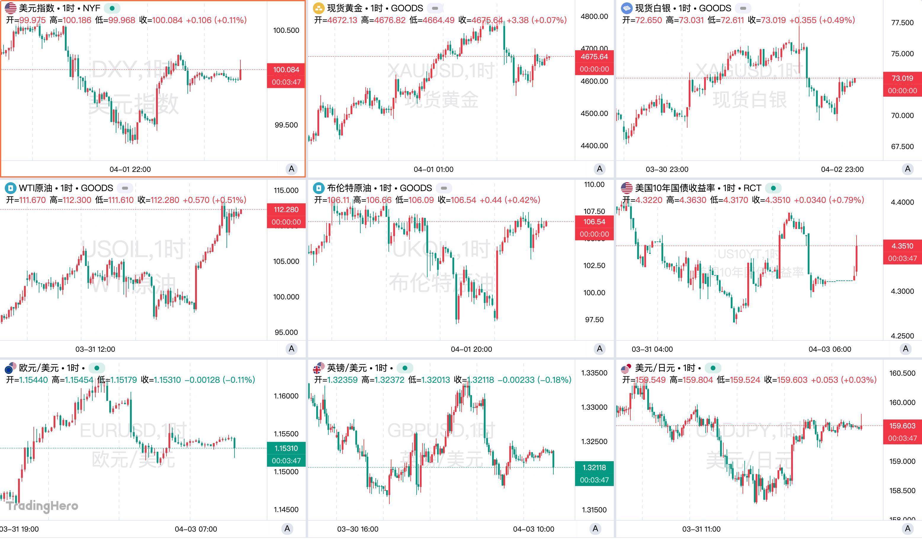 现货黄金本周先强后弱、整体仍偏强。周三在美元连跌和局势缓和预期推动下,现货金价升至逼近4800美元关口,创3月19日以来新高;但周四随着特朗普表态强硬、油价暴涨、市场担心高油价抬升通胀并压制降息,金价从高位部分回吐。现货白银本周波动更大,走势与黄金一致但弹性更强。